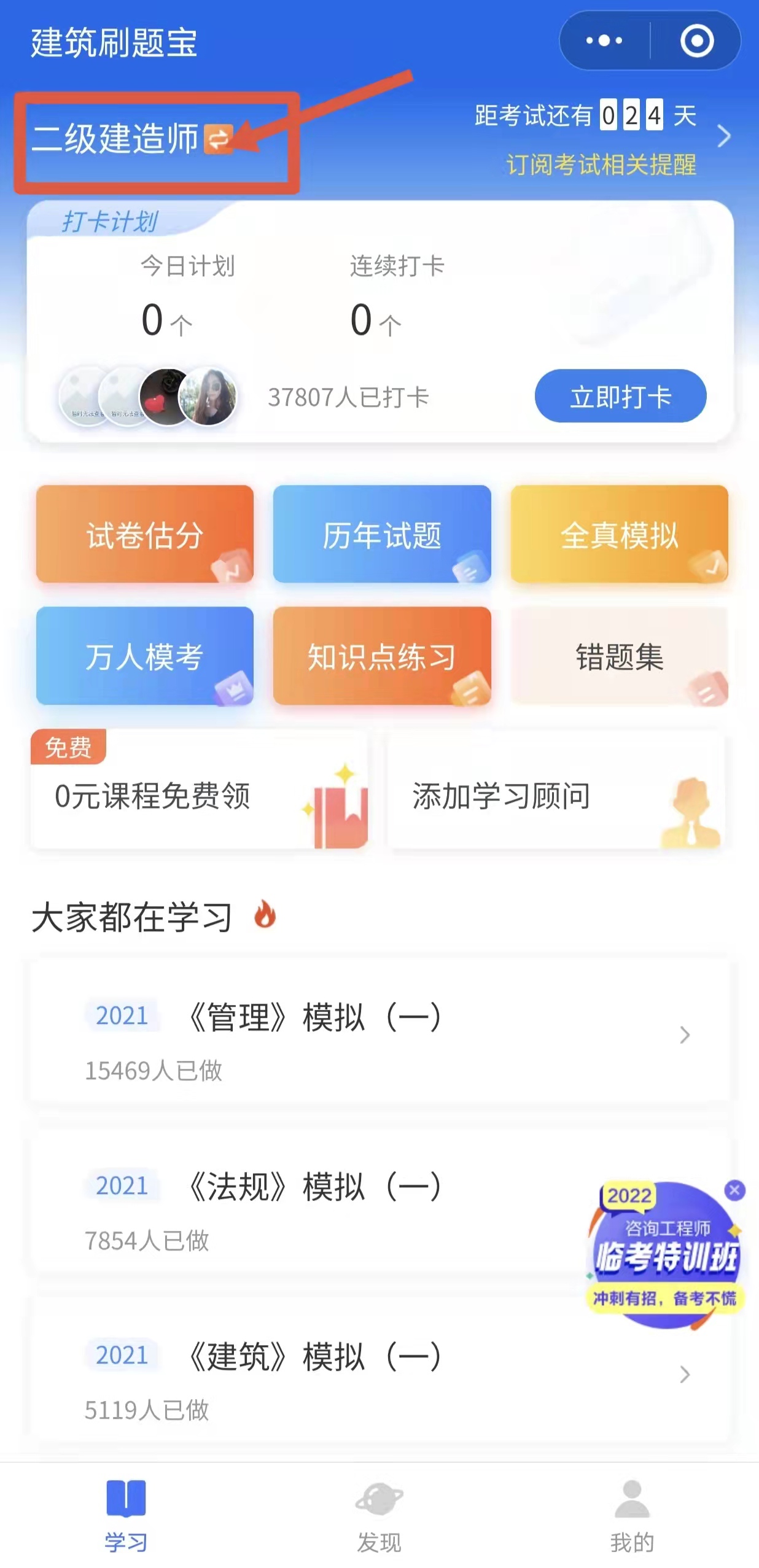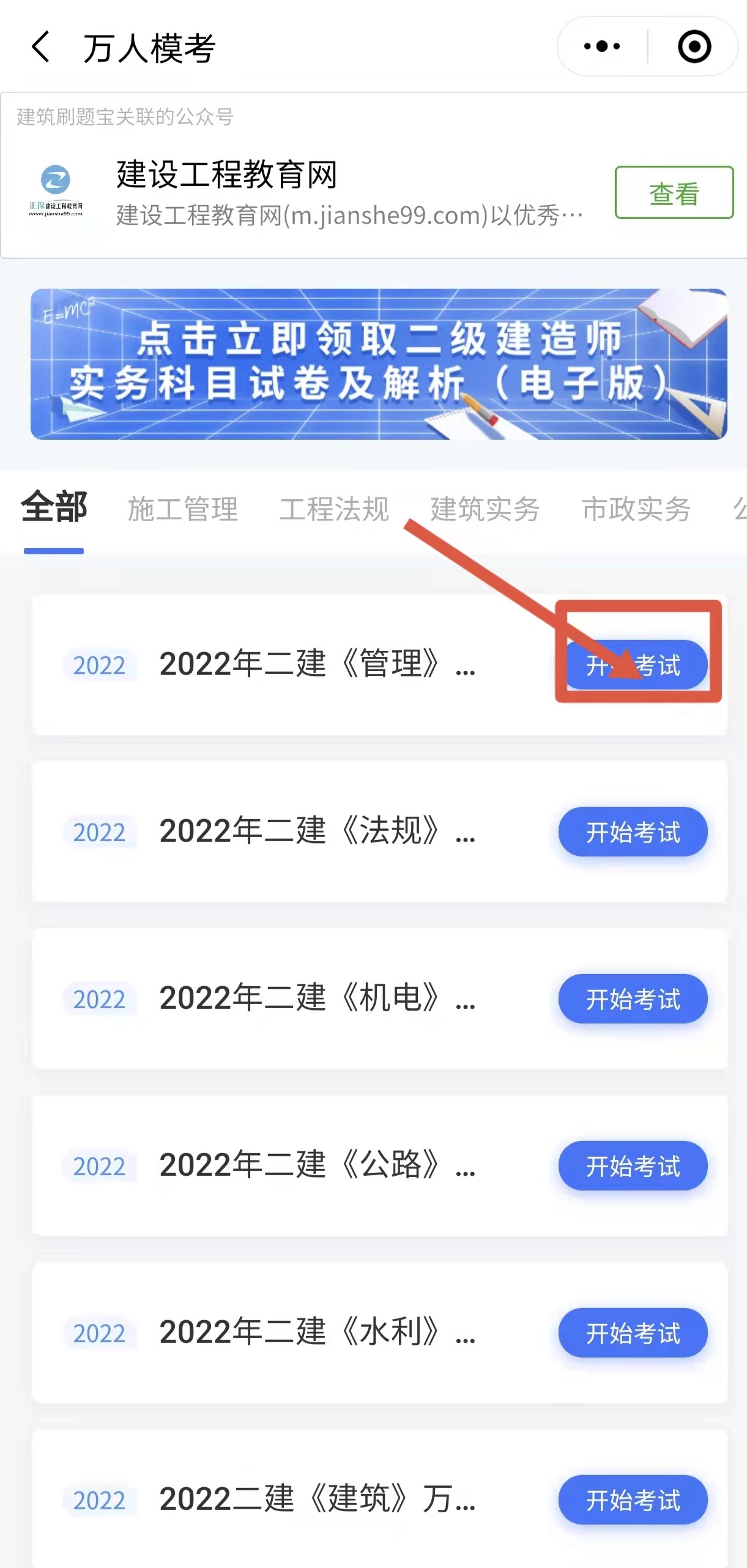 掃碼進入建筑刷題寶——選擇二級建造師——萬人模考,點擊即可直接進入模考中心。