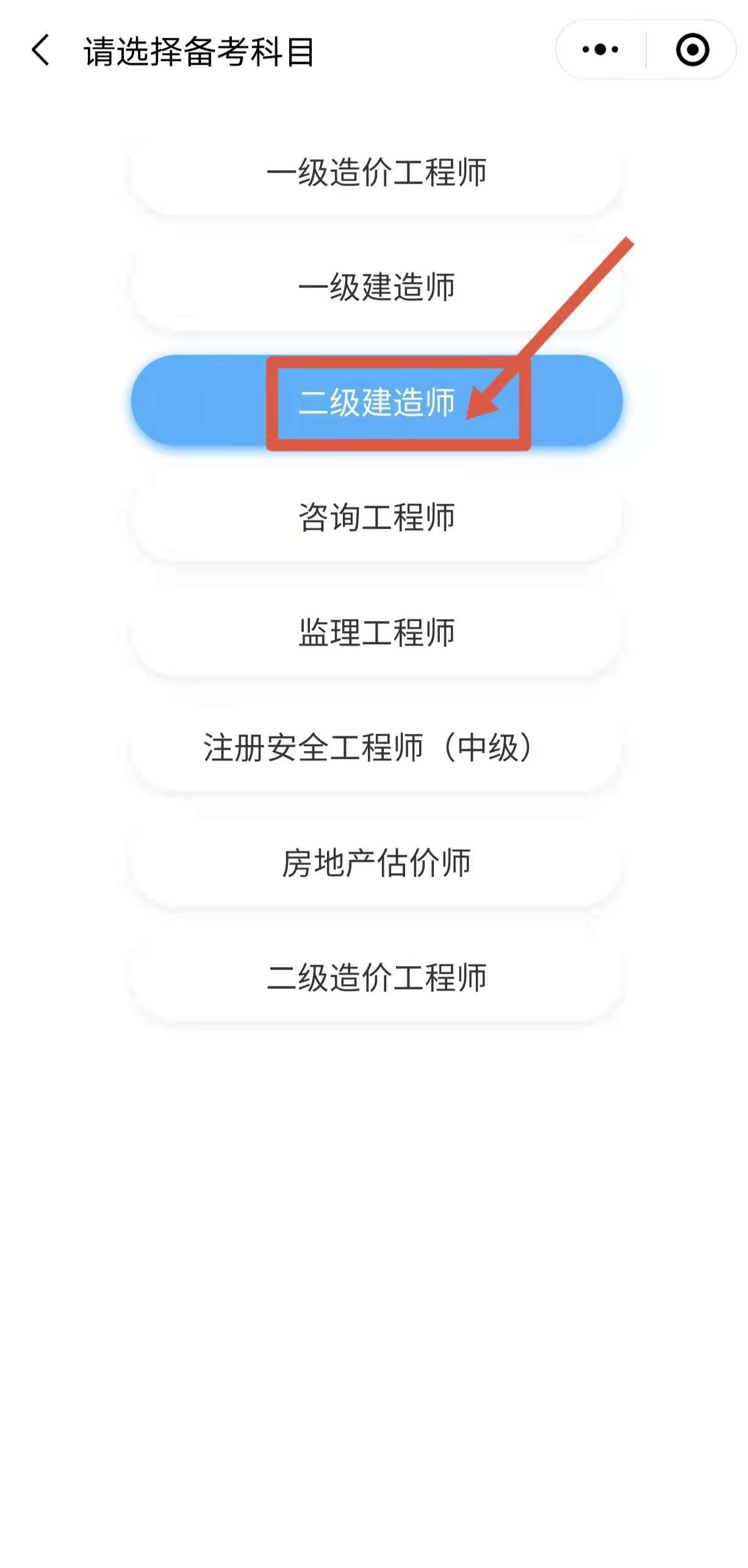 2、點擊圖一左上角標記處,跳轉(zhuǎn)至圖二(如下圖所示),選擇“二級建造師”;