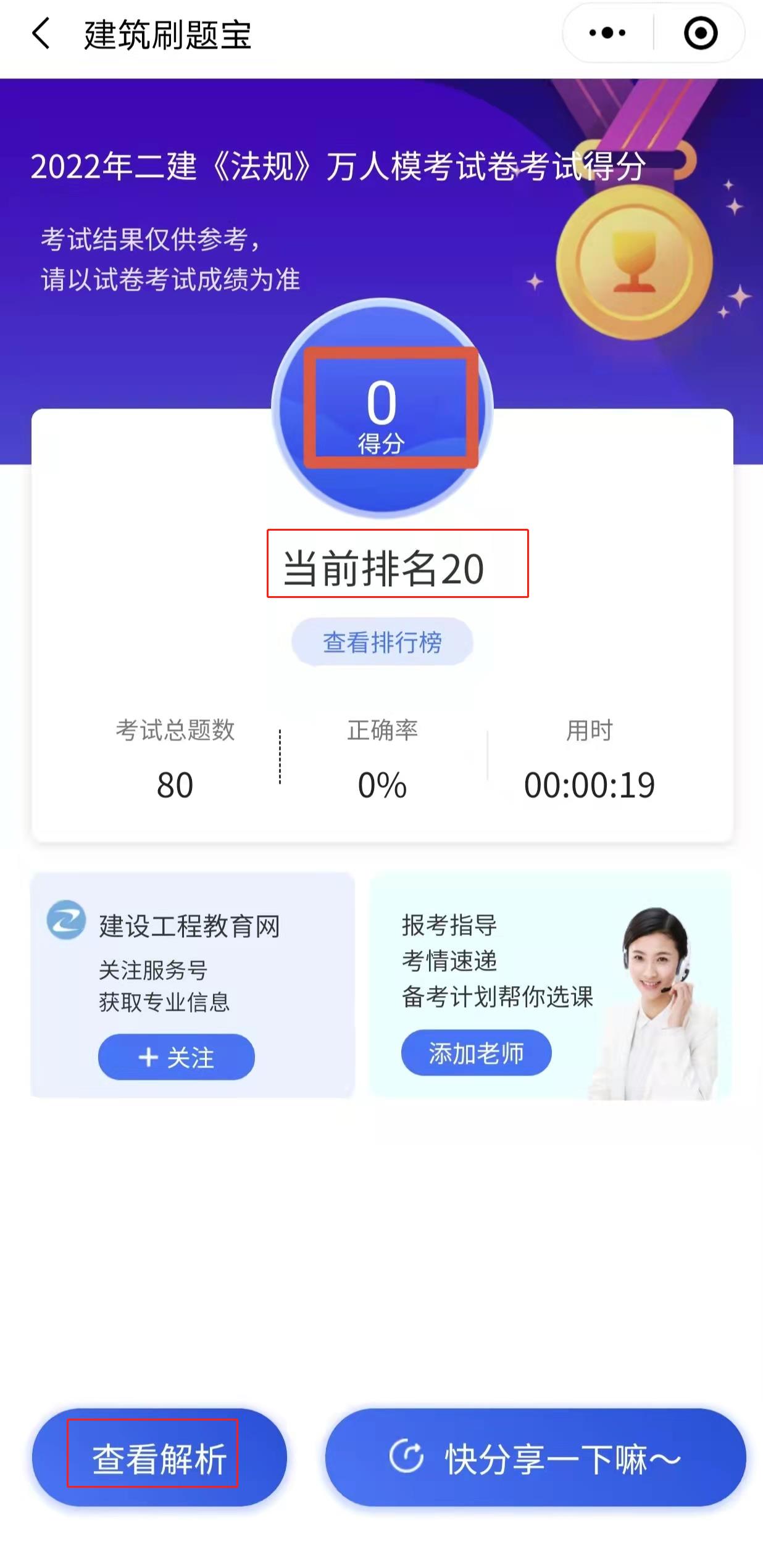 7、交卷之后考生可以查看自己的得分、排名以及解析。