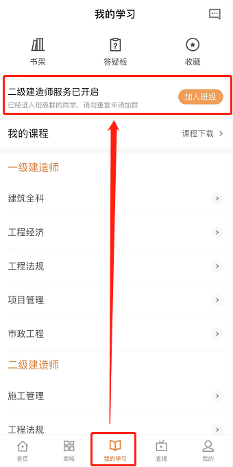 賬號(hào)登錄APP后,點(diǎn)擊“我的學(xué)習(xí)”,最上面顯示“二級(jí)建造師服務(wù)已開啟”點(diǎn)擊加入班級(jí)