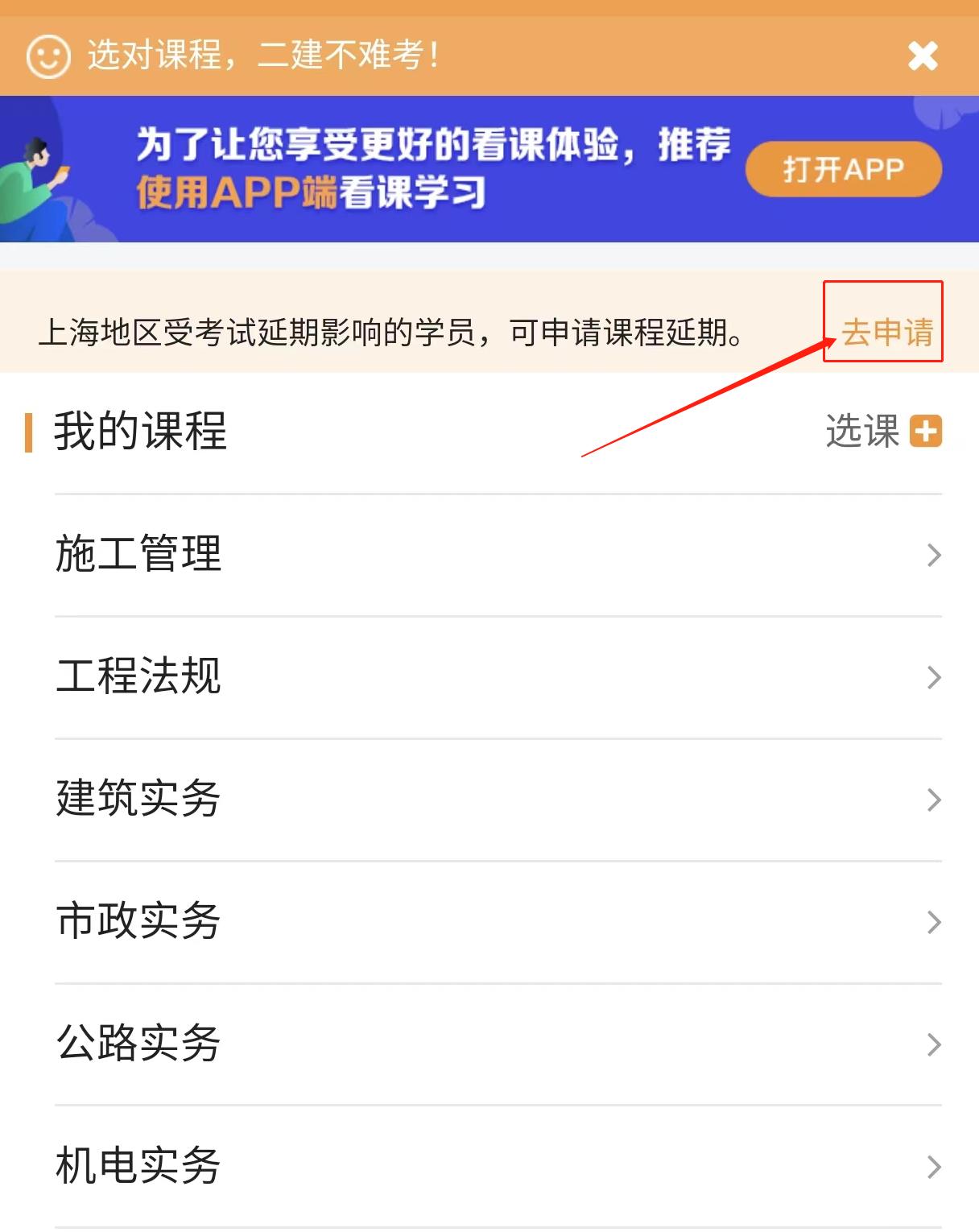 之前在網(wǎng)校報過2022年二級建造師課程的上??紖^(qū)的同學(xué),可以申請課程延期,申請時間為:4月27日-5月31日,入口在“我的網(wǎng)校我的家”,同學(xué)們及時提交申請,不要錯過了時間。