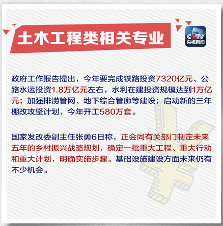 政府工作報(bào)告中指出2018年要完成鐵路、公路、水利等近3萬(wàn)億元,基礎(chǔ)設(shè)施方面仍有不少機(jī)會(huì)。央視新聞同時(shí)點(diǎn)出土木工程類(lèi)專(zhuān)業(yè),可謂是建筑人的福音,建筑產(chǎn)業(yè)位置依然牢不可撼。