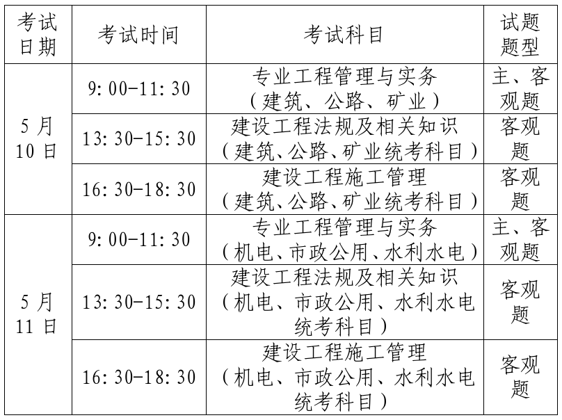 考試按《專業(yè)工程管理與實務》科目專業(yè)類別分2天2批次實施,具體考試時間、科目和題型見表格。