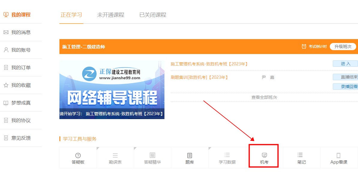 ?。?)找到下方“學(xué)習(xí)工具與服務(wù)”,點(diǎn)擊“機(jī)考”按鈕即可進(jìn)行機(jī)考模擬系統(tǒng)