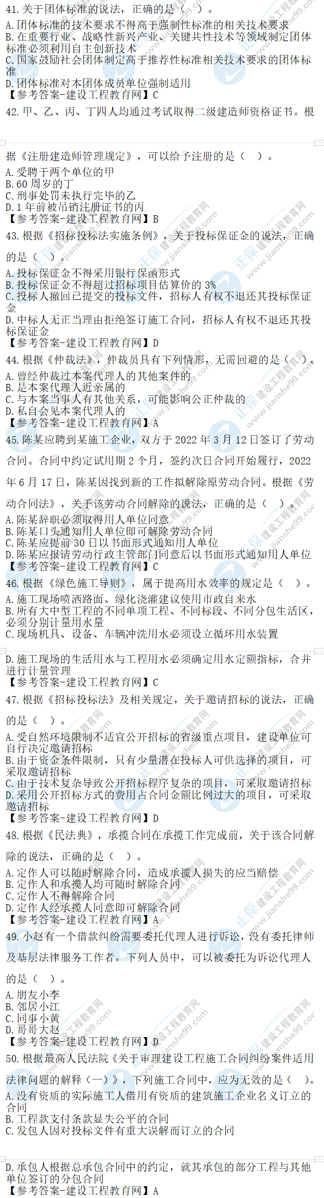 2023年二級(jí)建造師工程法規(guī)真題及答案41-50