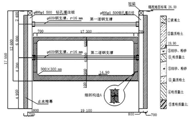 某公司承建城市橋區(qū)泵站調蓄工程,其中調蓄池為地下式現(xiàn)澆鋼筋混凝土結構,混凝土強度等級C35,池內(nèi)平面尺寸為62.0m×17.3m,筏板基礎。場地地下水類型為潛水,埋深6.6m。涉及基坑長63.8m,寬19.1m,深12.6m,圍護結構采用φ800mm鉆孔灌注樁排樁+2道φ609mm鋼支撐,樁間掛網(wǎng)噴射C20混凝土,樁頂設置鋼筋混凝土冠梁?;訃o樁外側采用厚度700mm止水帷幕,如下圖所示。施工過程中,基坑土方開挖至深度8m處,側壁出現(xiàn)滲漏,并夾帶泥沙;迫于工期壓力,項目部繼續(xù)開挖施工;同時安排專人巡視現(xiàn)場,加大地表沉降、樁身水平變形等項目的檢測頻率。按照規(guī)定,項目部編制了模板支架及混凝土澆筑專項施工方案,擬在基坑單側設置泵車澆筑調蓄池結構混凝土。
