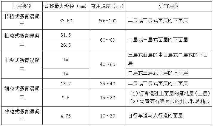 瀝青混凝土面層常用厚度及適宜層位 表2K311012