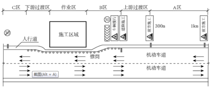 基坑臨近城市次干路,圍擋施工占用部分現(xiàn)況道路,項(xiàng)目部編制了交通導(dǎo)行圖(圖1)。在路邊按要求設(shè)置了A區(qū)、上游過渡區(qū)、B區(qū)、作業(yè)區(qū)、下游過渡區(qū)、C區(qū)六個(gè)區(qū)段,配備了交通導(dǎo)行標(biāo)志、防護(hù)設(shè)施、夜間警示信號。