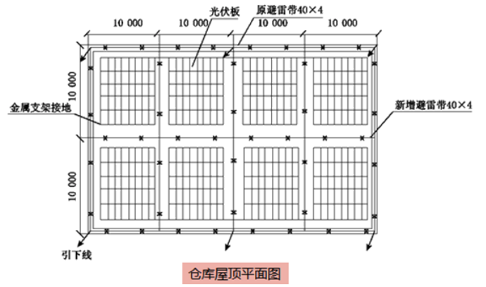 因光伏板安裝在倉(cāng)庫(kù)屋面,倉(cāng)庫(kù)建筑的防雷類(lèi)別應(yīng)提高一個(gè)等級(jí),建筑屋面需增加避雷帶(見(jiàn)圖3);光伏板用金屬支架固定,并接地可靠,20塊光伏板串聯(lián)成一個(gè)光伏直流發(fā)電回路,用2芯電纜接到直流匯流箱。項(xiàng)目部依據(jù)規(guī)范和設(shè)計(jì)要求編制了光伏發(fā)電工程的施工技術(shù)方案,并在施工前進(jìn)行了技術(shù)和安全交底。