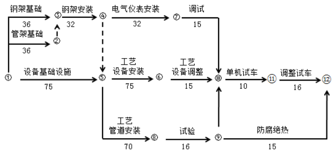 建設(shè)單位通過招標(biāo)與施工單位簽署了某工業(yè)項(xiàng)目的施工合同,主要工作內(nèi)容包含設(shè)備基礎(chǔ)、鋼架基礎(chǔ)、設(shè)備鋼架制作安裝、工藝設(shè)備、工藝管道,電氣和儀表設(shè)備安裝等。開工前施工單位按照合同約定向建設(shè)單位提交了施工進(jìn)度計(jì)劃(如下圖所示)。