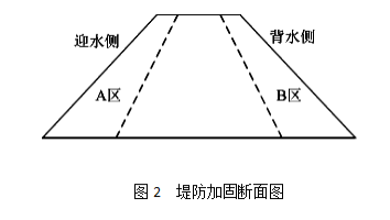 某堤防加固工程劃分為一個單位工程,工程建設內(nèi)容包括堤防培厚、穿堤涵洞拆除重建等。堤防培厚采用在迎水側(cè)、背水側(cè)均加培的方式,如圖2所示。根據(jù)設計文件,A區(qū)的土方填筑量為12萬m3,B區(qū)的土方填筑量為13萬m3。