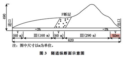 某雙車道公路隧道,全長620m,地層巖性為石灰?guī)r,地下水較豐富。有一條F斷層破裂帶,隧道最大埋深490m,縱坡為﹣3%。其圍巖級(jí)別及長度見隧道縱斷面示意圖。合同總工期為20個(gè)月。