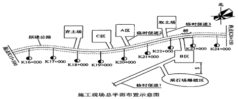施工現(xiàn)場(chǎng)總平面布置示意圖如下圖所示,現(xiàn)場(chǎng)需在A、B、C三個(gè)區(qū)域分別布置橋梁梁板預(yù)制場(chǎng)(含水泥混凝土拌合站)、水泥穩(wěn)定土拌合站和承包人駐地三種臨時(shí)工程。