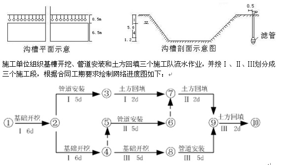 【參考答案】1.(1)降水井點(diǎn)布置采用單排井點(diǎn)不合理。溝槽深度達(dá)到5m,基坑寬度為6.5m,應(yīng)采用雙排井點(diǎn)布置。(2)井點(diǎn)管與基槽上口邊緣距離為0.5m不合理。井點(diǎn)管應(yīng)布置在基槽上口邊緣外1.0~1.5m. 2.降水深度為基底以下0.2m不正確,降水深度應(yīng)為基底以下0.5m. 3.管道安裝1到管道安裝2用虛線連上,箭頭指向安裝2.安裝2指向安裝3,箭頭指向安裝3.還有把4到5節(jié)點(diǎn)改成虛箭線,6到7節(jié)點(diǎn)改成虛箭線。