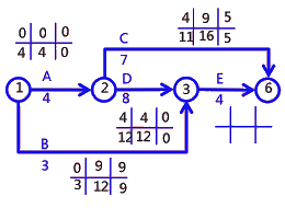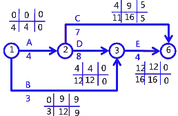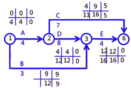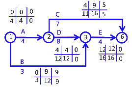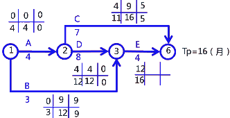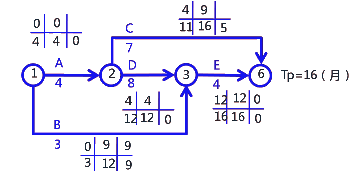 某住宅工程,磚混結(jié)構(gòu),地上7層。施工項(xiàng)目部將整個(gè)施工任務(wù)劃分成5個(gè)工作(A、B、C、D、E)。編制了施工進(jìn)度計(jì)劃雙代號(hào)網(wǎng)絡(luò)圖如下(單位:月)
