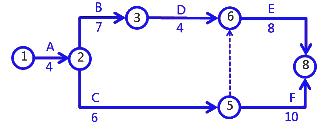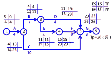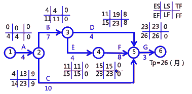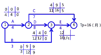 施工項(xiàng)目部編制了施工進(jìn)度計(jì)劃雙代號(hào)網(wǎng)絡(luò)圖,如下(單位:月)