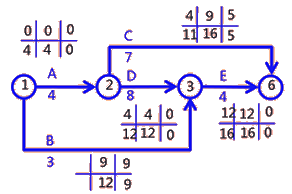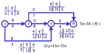 建設(shè)單位不施工單位簽訂了施工承包合同,合同工期16個(gè)月,施工項(xiàng)目部編制了施工進(jìn)度計(jì)劃雙代號(hào)網(wǎng)絡(luò)圖。如下(單位:月)。