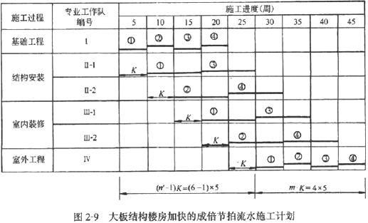 某建設(shè)工程由四幢大板結(jié)構(gòu)樓房組成,每幢樓房為一個(gè)施工段,施工過(guò)程劃分為基礎(chǔ)工程、結(jié)構(gòu)安裝、室內(nèi)裝修和室外工程4項(xiàng),其流水節(jié)拍分別為:5周、10周、10周、5周。一般的成倍節(jié)拍流水施工進(jìn)度計(jì)劃如圖2—8所示。