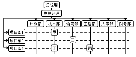 『答案解析』本題考查的是基本的組織結(jié)構(gòu)模式。圖中的組織結(jié)構(gòu)屬于矩陣式。在矩陣組織結(jié)構(gòu)中,每一項縱向和橫向交匯的工作,指令來自于縱向和橫向兩個工作部門,因此其指令源為兩個。在矩陣組織結(jié)構(gòu)中為避免縱向和橫向工作部門指令矛盾對工作的影響,可以采用以縱向工作部門指令為主或以橫向工作部門指令為主的矩陣結(jié)構(gòu)模式,上圖中實線表示以縱向工作部門指令為主。選項B錯誤,工程部可以對丙直接下達指令;