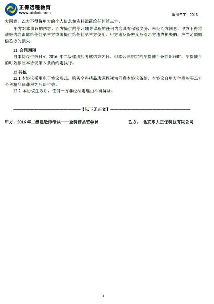 二級(jí)建造師全科“精品班”協(xié)議書