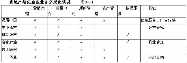 近年來(lái),在房地產(chǎn)經(jīng)紀(jì)行業(yè)的不斷發(fā)展過(guò)程中,一部分實(shí)力品牌企業(yè)在市場(chǎng)競(jìng)爭(zhēng)中脫穎而出,開(kāi)始實(shí)行多元化發(fā)展戰(zhàn)略(見(jiàn)表3—1),打通了二三級(jí)市場(chǎng)的傳統(tǒng)隔閡,實(shí)行一二手聯(lián)動(dòng)。原本從事新建商品房營(yíng)銷代理的企業(yè)把漸漸把觸角伸向存量房租售,而不少房屋中介也開(kāi)始試水新建商品房營(yíng)銷代理。不僅如此,還基于傳統(tǒng)的經(jīng)紀(jì)業(yè)務(wù)開(kāi)展顧問(wèn)咨詢、信息服務(wù)、按揭服務(wù)、物業(yè)管理、資產(chǎn)管理等新型衍生業(yè)務(wù)。