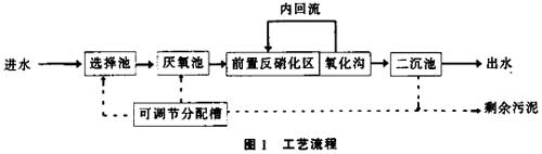 、圻M(jìn)水中的BOD是作為營養(yǎng)物質(zhì)供給聚磷菌活動的基質(zhì),故m(BOD)/m(TP)是衡量能否達(dá)到除磷的重要指標(biāo),一般認(rèn)為該值大于20,比值越大,除磷效果越明顯。本工程m(BOD)/m(TP)=30-45,可采用生物除磷工藝。處理工藝流程見圖1。