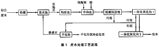 物化法和生化法聯(lián)合使用是處理印染廢水常規(guī)的典型工藝;炷恋砭哂忻撋腿コ龖腋∥锬芰(qiáng)的特點(diǎn),同時(shí)所投加的混凝劑也可以起到一定的調(diào)節(jié)pH作用。生化法對(duì)溶解性的有機(jī)物去除能力強(qiáng)。在本工程中,由于廢水中的主要污染物在pH為6~9條件下為難溶性的對(duì)苯二甲酸和各種分散染料等,因此綜合廢水先經(jīng)混凝沉淀,可有效地去除有機(jī)污染物、色度和調(diào)節(jié)pH值,并提高廢水的生化性能,為后續(xù)生化處理創(chuàng)造有利條件。生化法采用 氧化溝工藝,適用于該印染廢水水質(zhì)特點(diǎn)和對(duì)出水水質(zhì)高的要求。