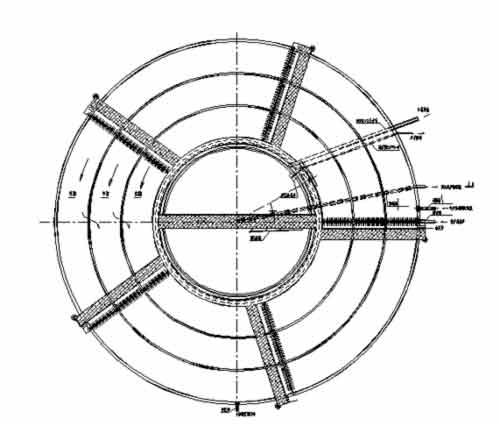 但應該看到,對于山區(qū)用地緊張的重慶庫區(qū)其占地偏大也是引人注目的缺點。由于氧化溝為圓形或橢圓形溝型,加上池中心設有中心島,造成氧化溝占地較大,平面布置相對困難;另外設置的輻流式沉淀池亦為圓形,使得廠區(qū)無效占地比例偏高。設計立足從盡量減少無效占地的角度對典型的ORBAL工藝氧化溝與二沉池分建的工藝進行了優(yōu)化,引進U.S.FILTER公司技術,確定氧化溝與二沉池合建方案,即二沉池外層設三圈氧化溝,呈同心布置,二沉池取代了ORBAL氧化溝中心島,具體形式見下圖。