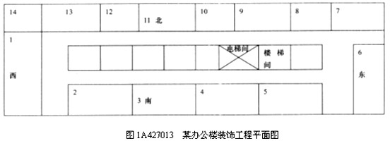 某公司承接了某辦公樓的裝飾工程,平面如何1A427013所示,該樓共6層,首層為大堂和會(huì)議用房,2層為出租用房,4層為待租用房,4層以上為辦公用房。合同裝飾范圍為:辦公、首層全部進(jìn)行裝飾、待租用房只進(jìn)行隔墻、門(mén)安裝和公共部分(包括走道)的施工;出租用房由租憑單位自行裝修。該工程結(jié)構(gòu)、初裝修、水、電已施工完成,通過(guò)竣工驗(yàn)收,并完成了備案。