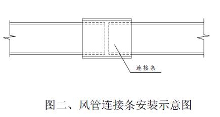 5.2.6 風(fēng)管之間采用板材尺寸為 5~8cm連接條連接,連接方式如圖二所示,選配規(guī)格參見表一。先將風(fēng)管連接邊與另一風(fēng)管連接邊涂上粘接劑對接,再用連接條粘貼在風(fēng)管對接縫處。