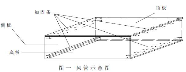 在矩形風(fēng)管內(nèi)四個(gè)直角處先粘貼加固條,加固條的尺寸約為 15 ×15mm或 20×20mm(如圖一所示)。蓋板邊及側(cè)板邊涂完粘接劑后,由風(fēng)管的任一端至另一端,慢慢使其粘接起來。