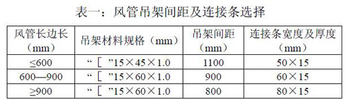 按圖紙放線確定風(fēng)管打孔位置,經(jīng)技術(shù)員確認(rèn)后進(jìn)行打孔、固定吊桿。吊桿使用Φ8mm鍍鋅螺桿,吊架采用 U型輕鋼龍骨制作,使用螺母調(diào)節(jié)其平衡,其間距及吊架材料參見表一。吊桿絲紋打入天花應(yīng)在 2.5cm以內(nèi),避免破壞已預(yù)埋線管。風(fēng)管吊裝時(shí),其頂部離天花板保證2~4cm的。