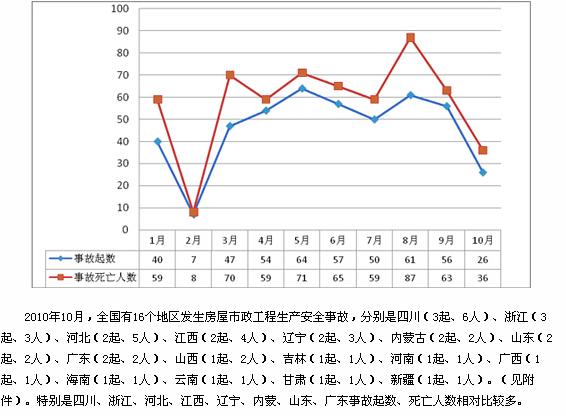 2010年10月,全國共發(fā)生房屋市政工程生產(chǎn)安全事故26起、死亡36人,比去年同期事故起數(shù)減少47起、死亡人數(shù)減少46人,同比分別下降64.38%和56.10%。