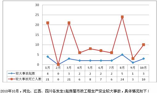 2010年10月,全國共發(fā)生房屋市政工程生產(chǎn)安全較大事故3起、死亡10人,比去年同期事故起數(shù)增加1起、死亡人數(shù)增加3人,同比分別上升50.00%和42.86%。