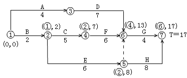 答:1.用標號法找關鍵線路,計算工期。如下圖所示。則計劃關鍵線路為:B-C―F-G;計劃工期為17天。