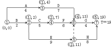 2.用標號法找關鍵線路,計算工期,如下圖所示。則實際關鍵線路為:B-E―H;實際工期為19天。