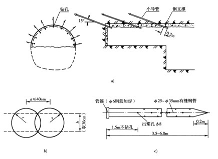 1.小導管注漿是淺埋暗挖隧道超前支護的一種措施。在軟弱、破碎地層中鑿孔后易塌孔,且施作超前錨桿比較困難或者結構斷面較大時,應采取超前小導管支護。超前小導管支護必須配合鋼拱架使用。
