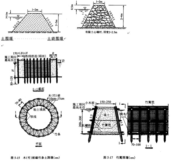 | 竹籬土圍堰 | 水深1.5~7m,流速≤2.0m/s,河床滲水性較小,能打樁盛,產(chǎn)竹木地區(qū) | |