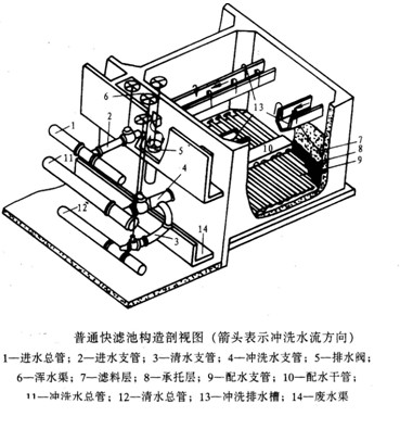 濾池內(nèi)由清水區(qū)、濾板、濾料層、渾水區(qū)組成,其中濾板包括支承梁、濾梁、濾板、濾頭;濾料層由承托層、濾料(石英砂或無煙煤或碳顆粒)構(gòu)成;渾水區(qū)設(shè)進水管和反沖洗集水槽。