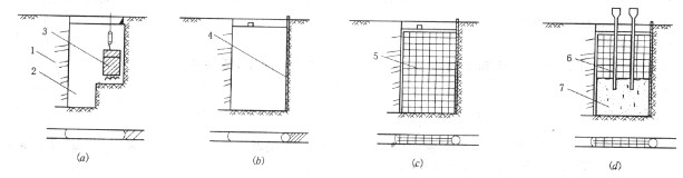 (a)成槽;(b)插入接頭管;(c)放入鋼筋籠;(d)澆注混凝土