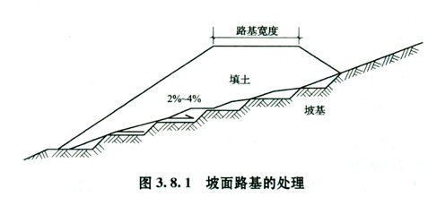 3、防路基側(cè)向滑移方面:當(dāng)?shù)孛嫫露榷赣?:5時(shí),需修成臺(tái)階形式,每層臺(tái)階高度≯300mm 寬度≮1.0m