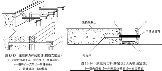 傳力桿的固定安裝方法有兩種。一種是端頭木模固定傳力桿安裝方法,宜用于混凝土板不連續(xù)澆筑時(shí)設(shè)置的脹縫。另一種是支架固定傳力桿安裝方法,宜用于混凝土板連續(xù)澆筑時(shí)設(shè)置的脹縫。兩種方法見圖示。