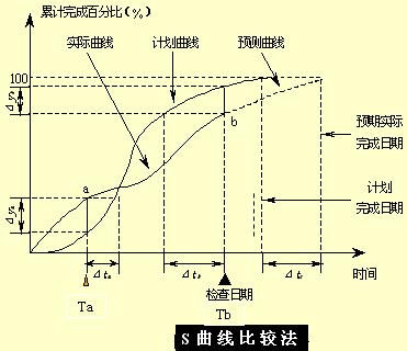 在S曲線比較圖中可以直接讀出實際進度比計劃進度超前或拖后的時間。如圖4—11所示,△Ta:表示Ta時刻實際進度超前的時間;△Tb表示Tb時刻實際進度拖后的時間。
