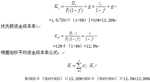 拓展:除了應(yīng)掌握股票的資金成本率的計(jì)算公式之外,考生還應(yīng)重點(diǎn)理解發(fā)行債券的資金成本率的計(jì)算公式,也可能是某一個(gè)企業(yè)同時(shí)發(fā)行股票和債券,計(jì)算其加權(quán)平均資金成本率。