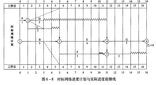 答案:繪制實際進度前鋒線(如圖6-8中虛線所示)(10分)。