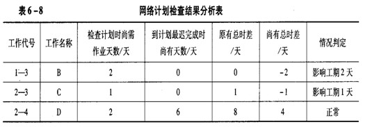 答案:網絡計劃檢查結果分析見表6-8(10分)。