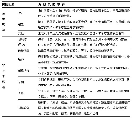 通過(guò)適當(dāng)?shù)娘L(fēng)險(xiǎn)分解方式來(lái)識(shí)別風(fēng)險(xiǎn)是建立建設(shè)工程初始風(fēng)險(xiǎn)清單的有效途徑。對(duì)于大型、復(fù)雜的建設(shè)工程,首先將其按單項(xiàng)工程、單位工程分解,再對(duì)各單項(xiàng)工程、單位工程分別從時(shí)間維、目標(biāo)維和因素維進(jìn)行分解,可以較容易地識(shí)別出建設(shè)工程主要的、常見(jiàn)的風(fēng)險(xiǎn)。從初始風(fēng)險(xiǎn)清單的作用來(lái)看,因素維僅分解到各種不同的風(fēng)險(xiǎn)因素是不夠的,還應(yīng)進(jìn)一步將各風(fēng)險(xiǎn)因素分解到風(fēng)險(xiǎn)事件。表4一2為建設(shè)工程初始風(fēng)險(xiǎn)清單示例。