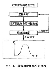 理論概率分布也是風險衡量中所經(jīng)常采用的一種估計方法。即根據(jù)建設工程風險的性質(zhì)分析大量的統(tǒng)計數(shù)據(jù),當損失值符合一定的理論概率分布或與其近似吻合時,可由特定的幾個參數(shù)來確定損失值的概率分布。理論概率分布的模擬過程如圖4一6所示。