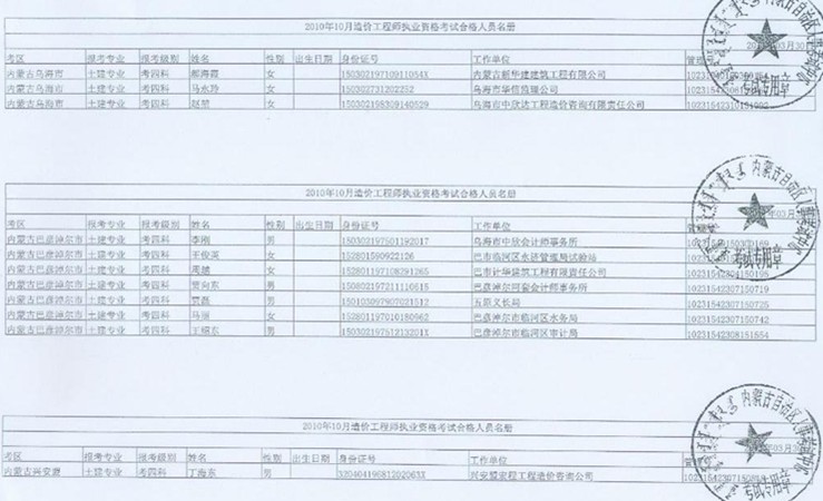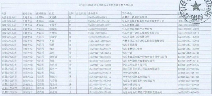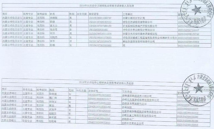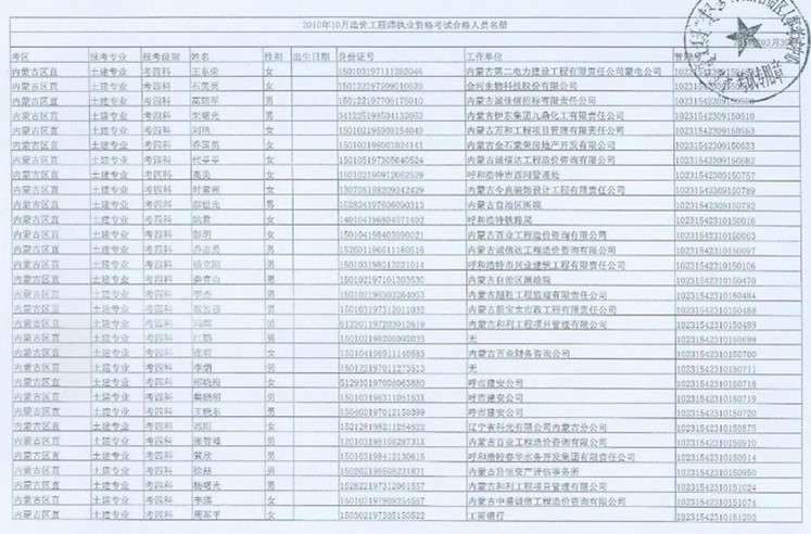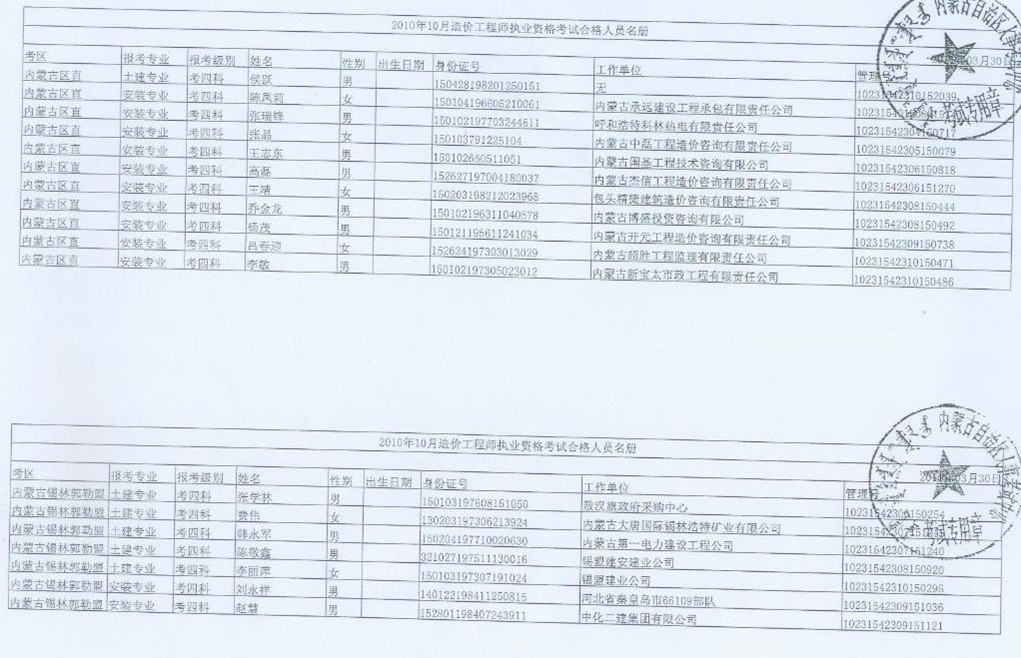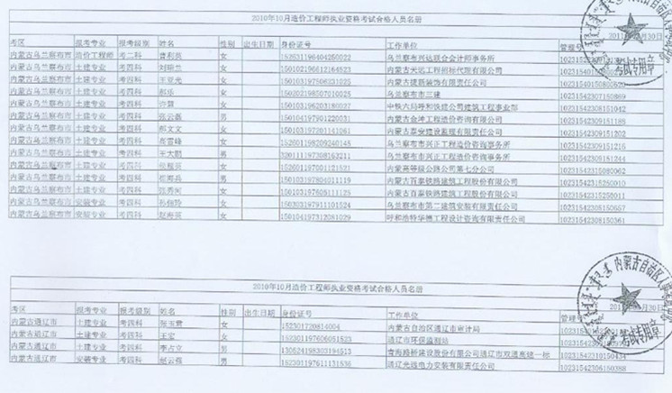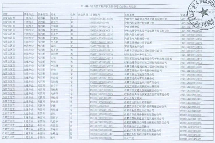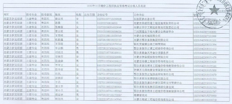 2011年內(nèi)蒙古造價(jià)工程師考試合格人員名單