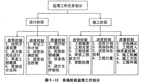如果建設(shè)工程進行實施階段全過程監(jiān)理,監(jiān)理工作劃分可按設(shè)計階段和施工階段分別歸并和組合,如圖5-11所示。